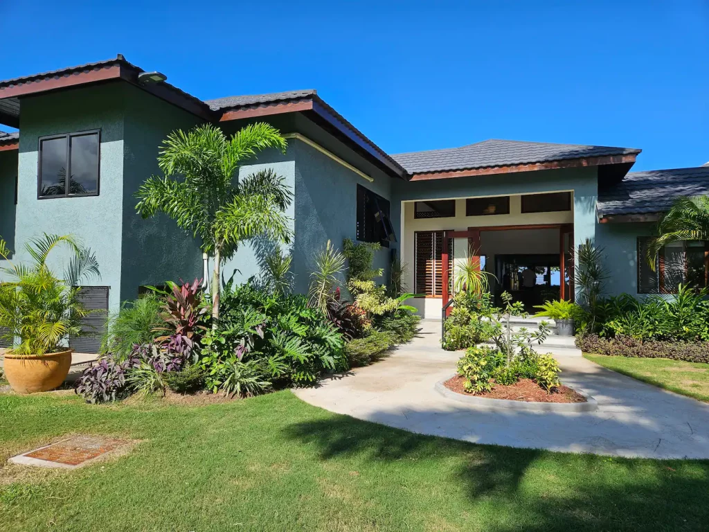 The beach house offers picturesque views of the glittering Caribbean Sea, with its turquoise waves gently lapping against the shore, and the lush surrounding landscape adorned with swaying palm trees, vibrant tropical flowers, and golden sunsets that paint the sky in breathtaking hues.